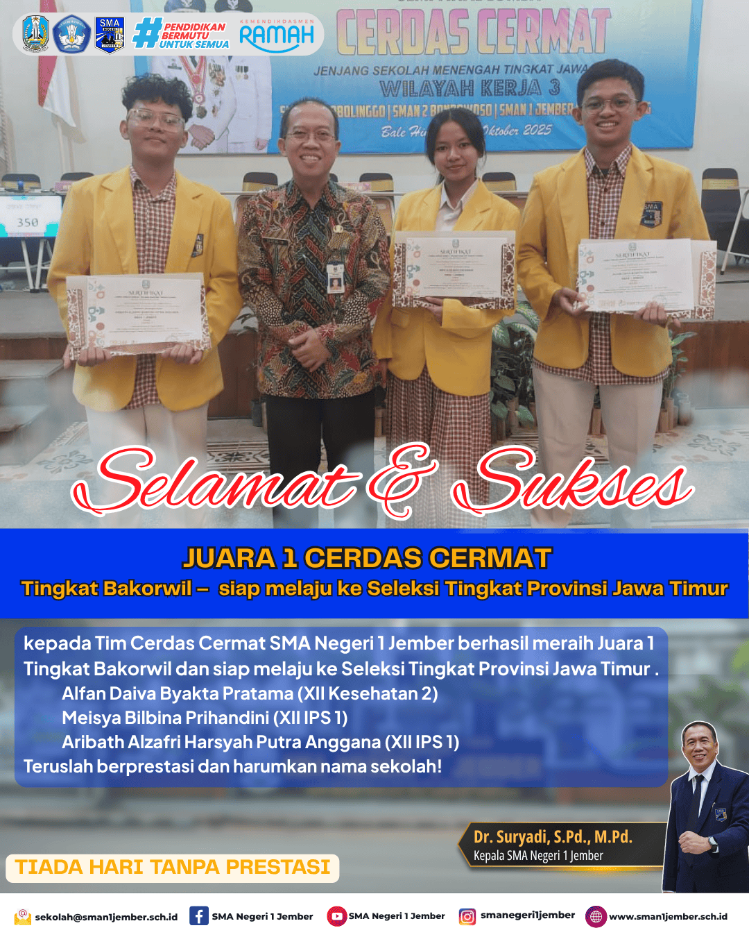 Keluarga Besar SMA Negeri 1 Jember mengucapkan Selamat Hari Kesaktian PancasilaRabu, 1 Oktober 2025Mari kita jadikan Pancasila sebagai perekat bangsa, penguat persatuan, dan pijakan dalam mewujudkan Indonesia