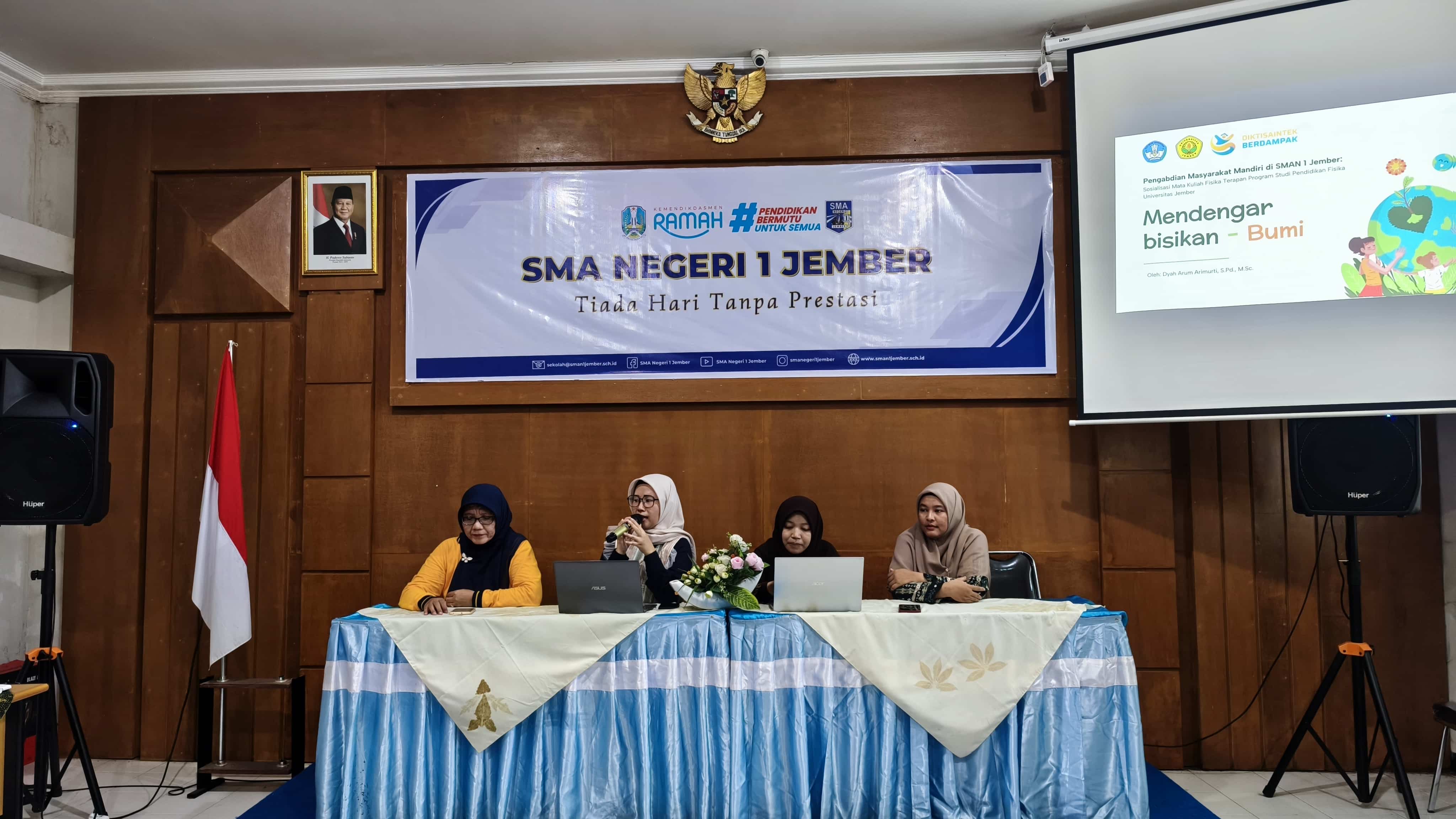 Tiga dosen dari Jurusan Pendidikan Fisika FKIP Universitas Jember hadir dalam kegiatan ini, yaitu Ibu Firdha Kusuma Ayu Anggraeni, S.Si., M.Si., Ibu Dyah Arum Arimurti, S.Pd., M.Sc., dan Ibu Tyas Nisa Fadilah, S.Pd., M.Si. Mereka melaksanakan program yang berfokus pada sosialisasi mata kuliah Fisika Terapan dari Program Studi Pendidikan Fisika Universitas Jember, sekaligus memperkenalkan penerapan konsep-konsep fisika dalam kehidupan sehari-hari kepada siswa dan guru di SMA Negeri 1 Jember.